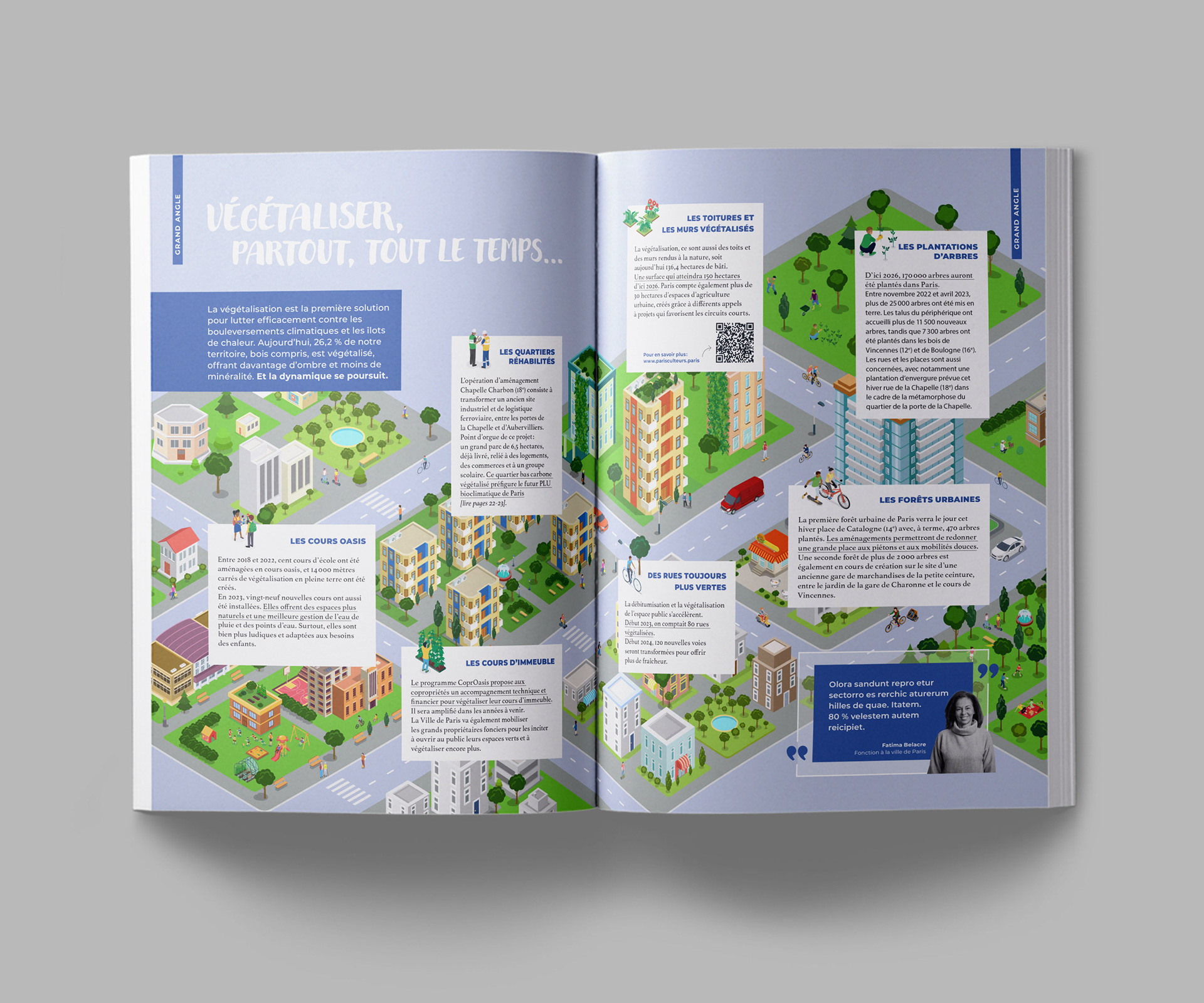 Une attention particulière a été portée à l’iconographie (photographies et illustrations), qui incarne l’humain dans la ville et renforce l’impact visuel, avec une exigence de qualité et de lisibilité.