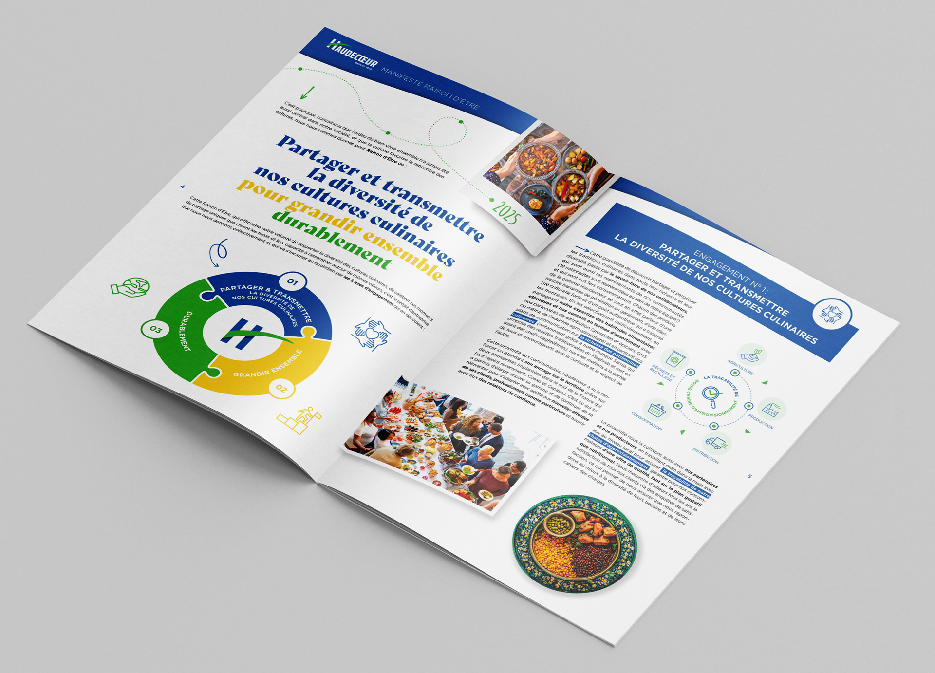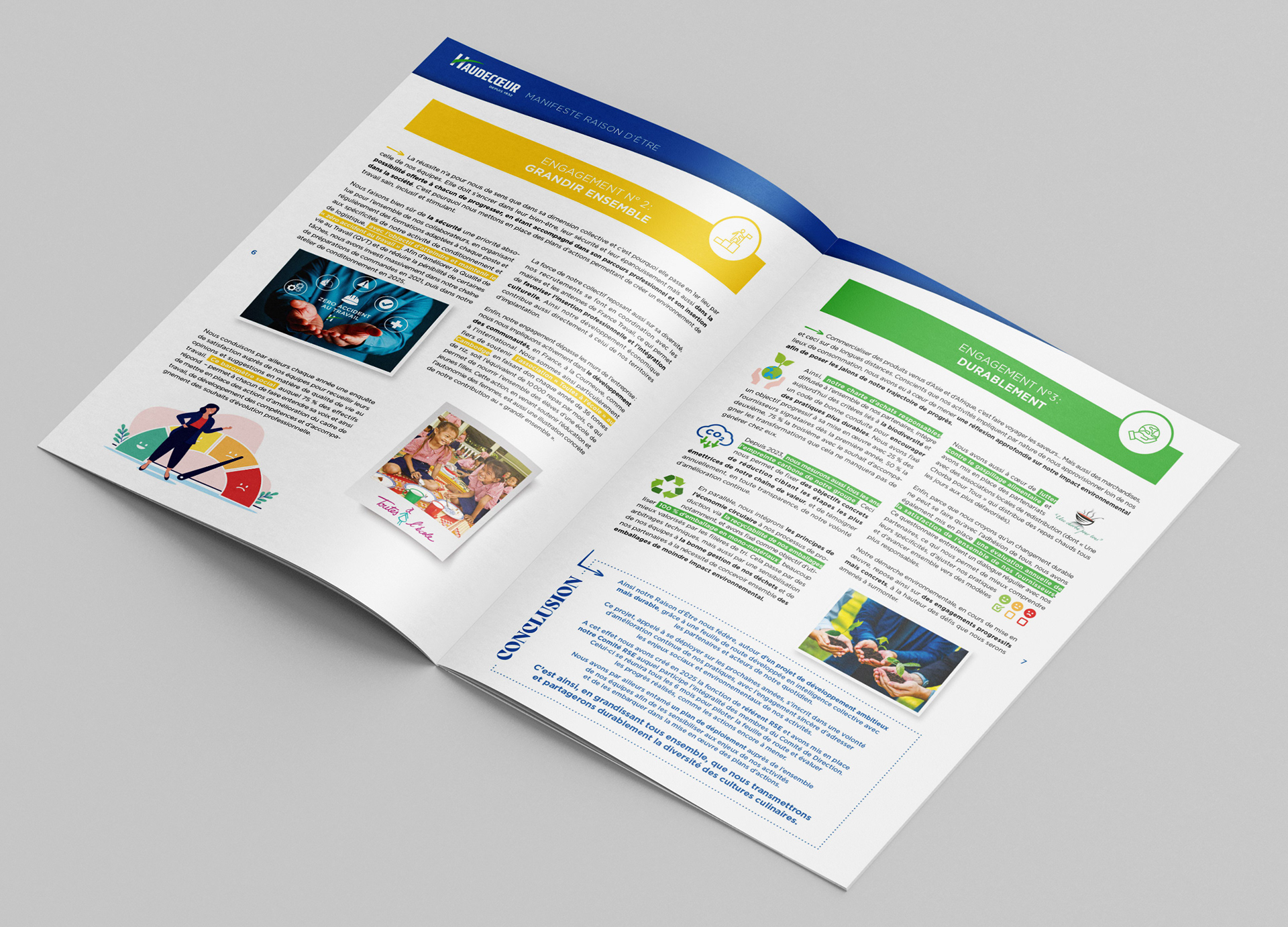 L’objectif était de concevoir un document de 8 pages, destiné à valoriser leur Raison d’Être auprès de leurs collaborateurs internes ainsi que de leurs partenaires externes.