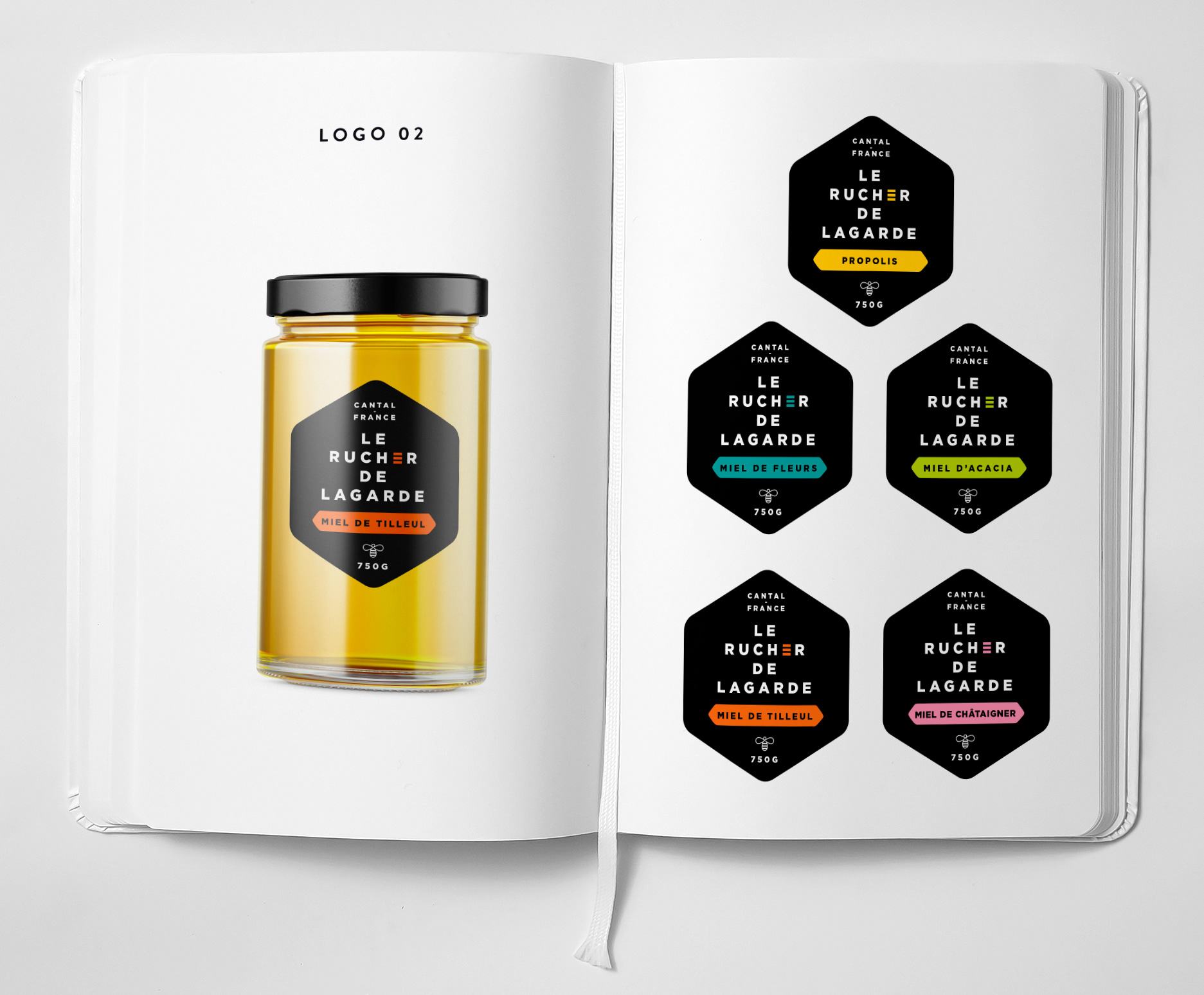 Le Rucher de Lagarde est une société installée dans le Cantal, ils produisent de manière artisanale du miel et des produits de la ruche (Pollen, pain d'épice, nougat…). J'ai eu la chance d'être interrogée au départ de leur aventure, j'ai donc créé l'identité graphique qui n'existait pas et toute la gamme d'étiquettes de leurs différents produits.