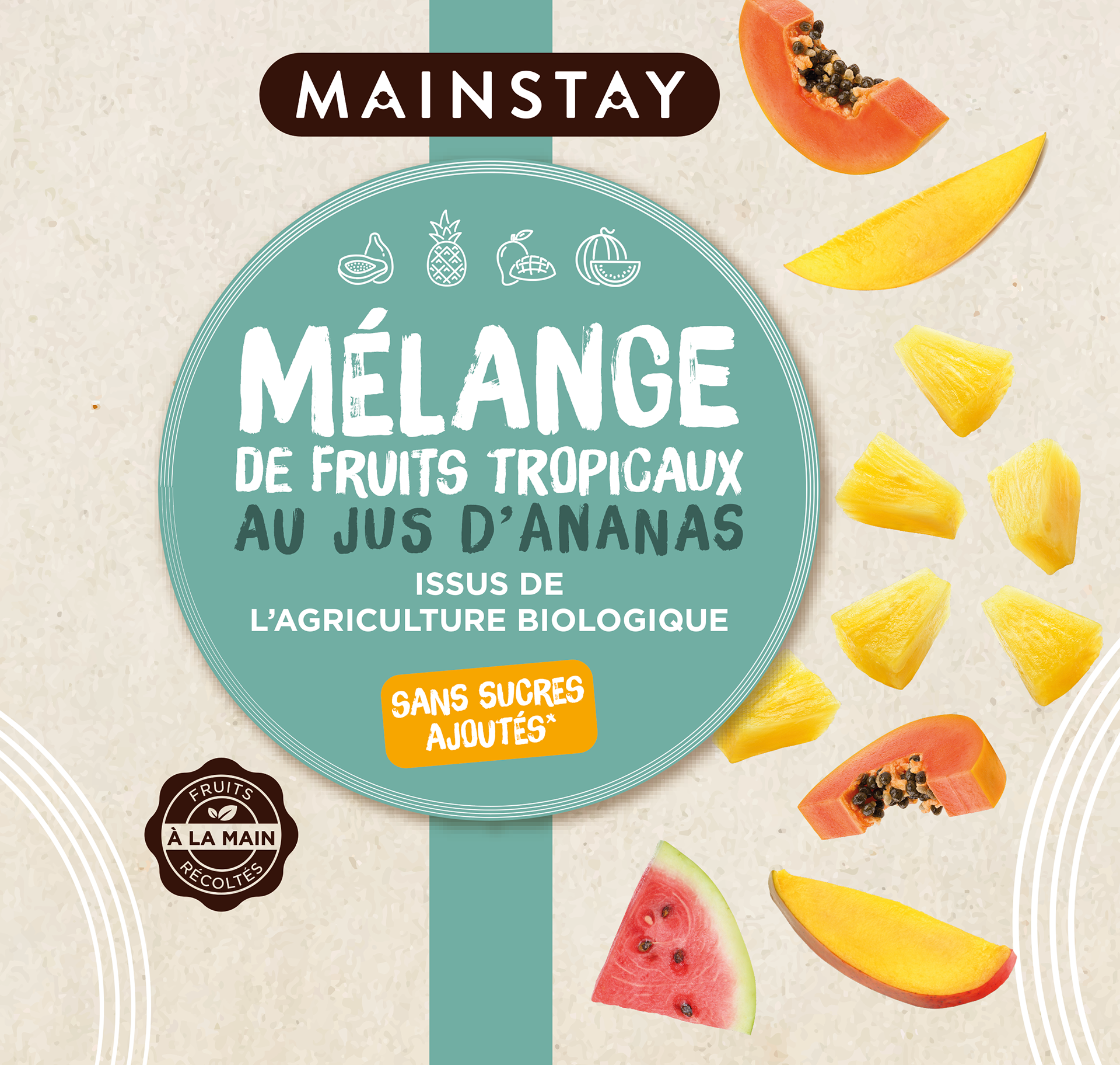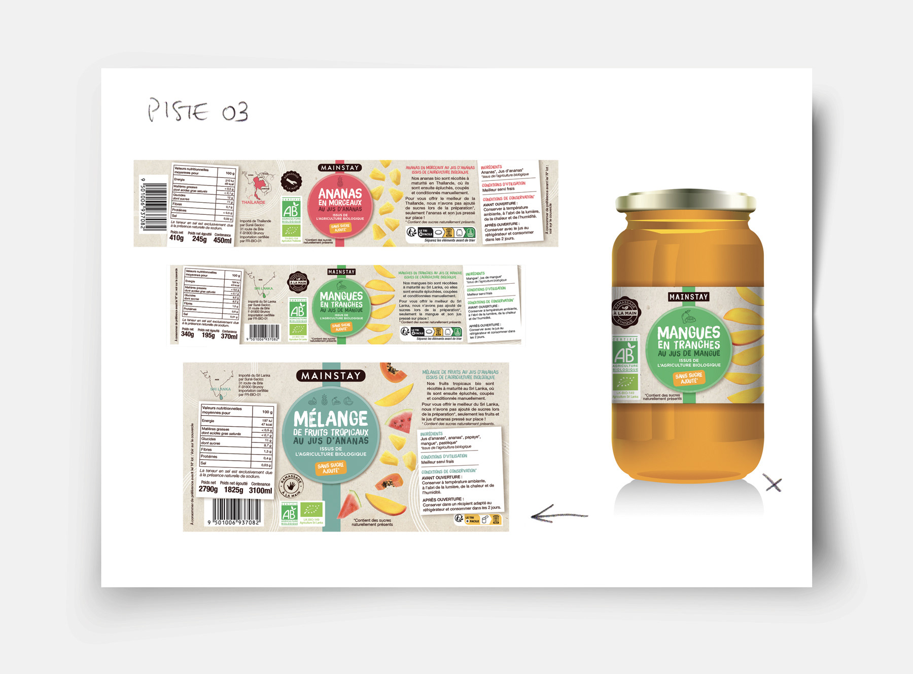 Sa marque MAINSTAY propose une gamme de 5 produits en provenance du Sri Lanka et de Thaïlande. Il existait déjà des étiquettes, mais qui n'étaient pas du tout adaptées à la qualité des produits, que l'on peut trouver en magasins BIO et en GMS.